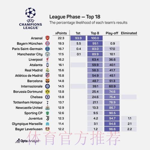 查看更多当一份来自OPTA的欧冠淘汰赛概率榜单将阿森纳推到“100%出线”的位置、却只把巴塞罗那排在第9名时,球迷的第一反应往往不是惊喜,而是疑问 这份数据到底在告诉我们什么 是阿森纳已经跻身绝对豪门 还是巴